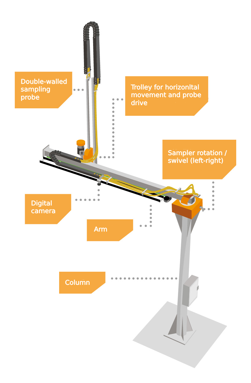 - Elég hosszú függőleges szonda (4 m), amely lehetővé teszi, hogy reprezentatív mintát vegyen egy pontosan kiválasztott helyről (tartálynyílás), és alkalmas magas rétegek (töltések) mintavételére is.